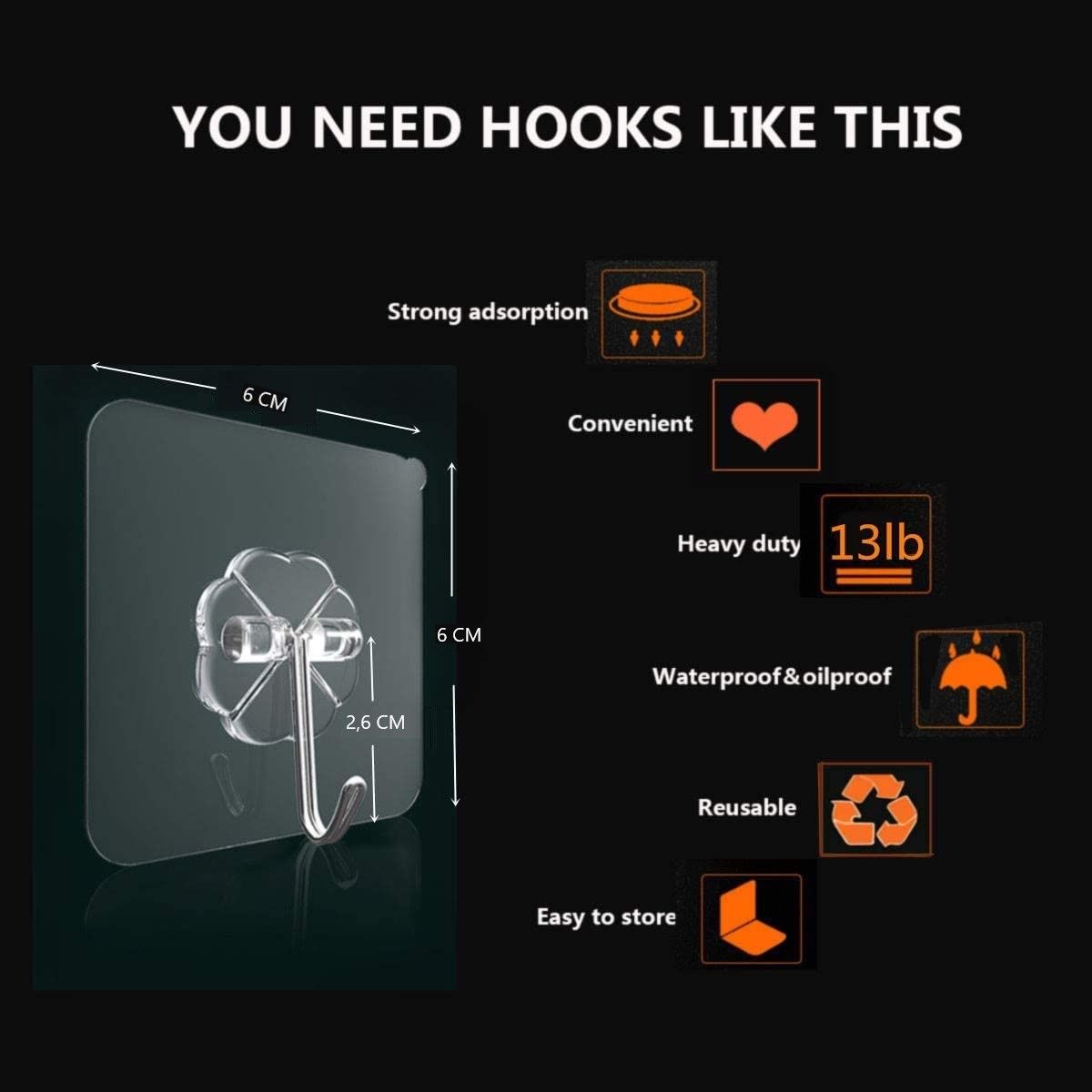 - Easy to use and reusable: Just clean and dry the surface, then put the hook on smooth surface. Easy to clean and re-position without surface damage. It can be reused again and again if dried with a hair dryer - much better than the suction cup hooks.