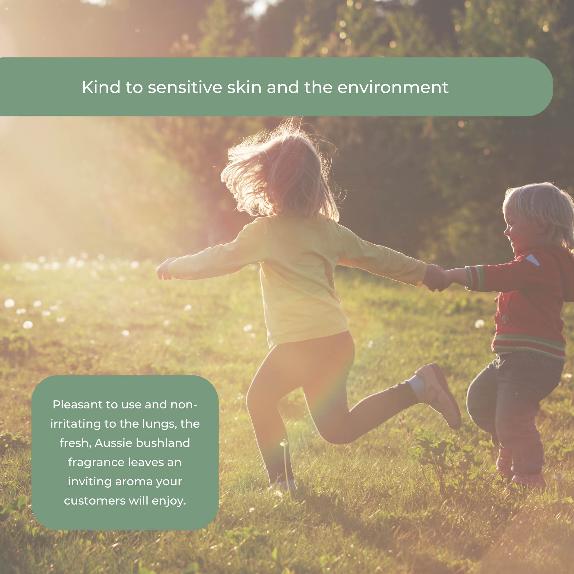 A triple-action natural cleaner, freshener and disinfectant. Perfect for general cleaning use and a natural alternative to surface cleaning sprays. Eucalyptus oil is a natural solvent, highly effective at cutting grease and grime while being kind to sensitive skin and the environment. Pleasant to use and non-irritating to the lungs, the fresh, Aussie bushland fragrance leaves an inviting aroma your customers will enjoy.