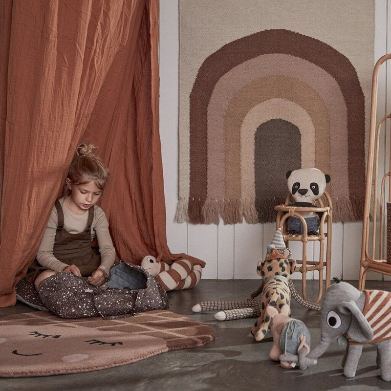 The gorgeous Acorn Floor Rug is a rich chestnut brown colour in two shades, with a serene, smiling face detailed in black with rosy, pink cheeks. The Acorn Rug is the perfect match to the new colourway.