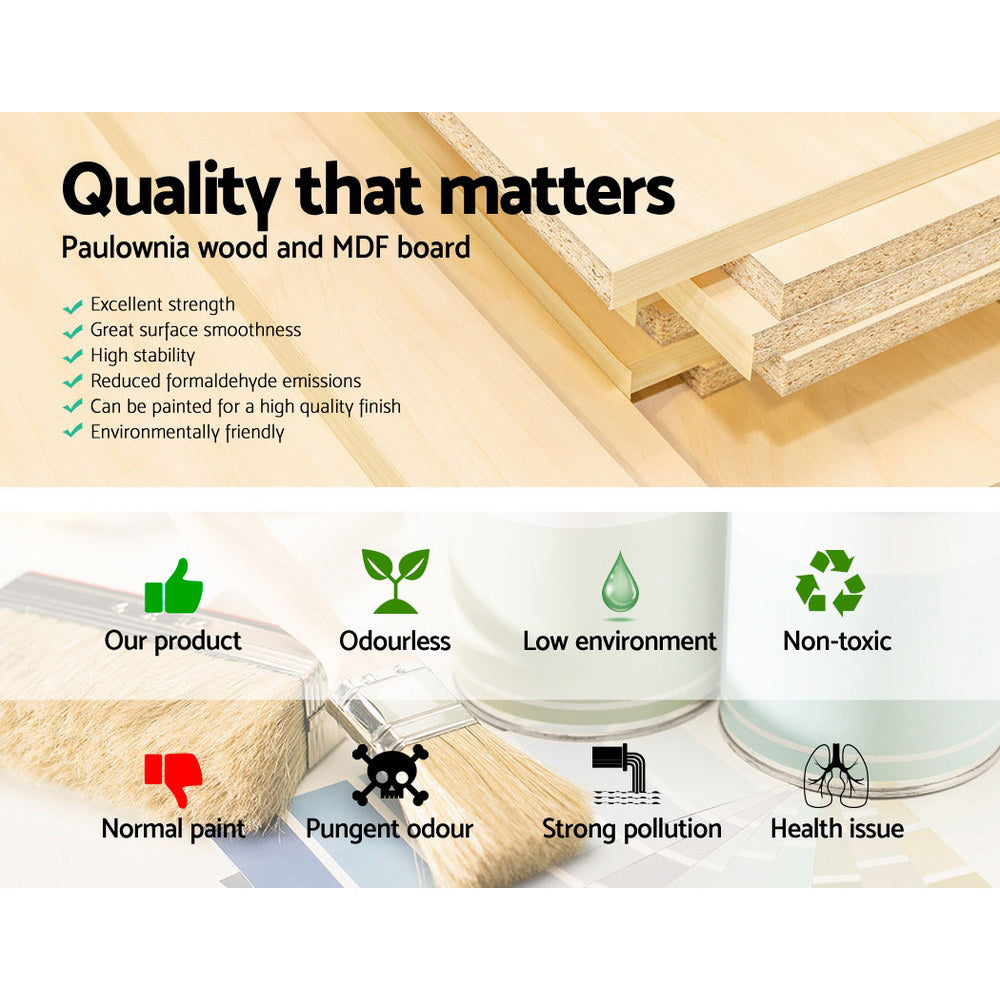 With its vintage chic, our Artiss Thyme Bedside Table is as stylish as it is practical. The 18mm thickness Paulownia wood and MDF construction ensure that the furniture piece is able to withstand daily robust use. The drawer is deep and runs smoothly while the bottom shelf adds an extra display shelf. Use it in any space or in any room where a convenient and compact drawer will do wonders to your storage needs. Finished in an eco-friendly non-toxic paint, the ensemble also includes an antique-inspired handle and anti-scratch feet pads.
