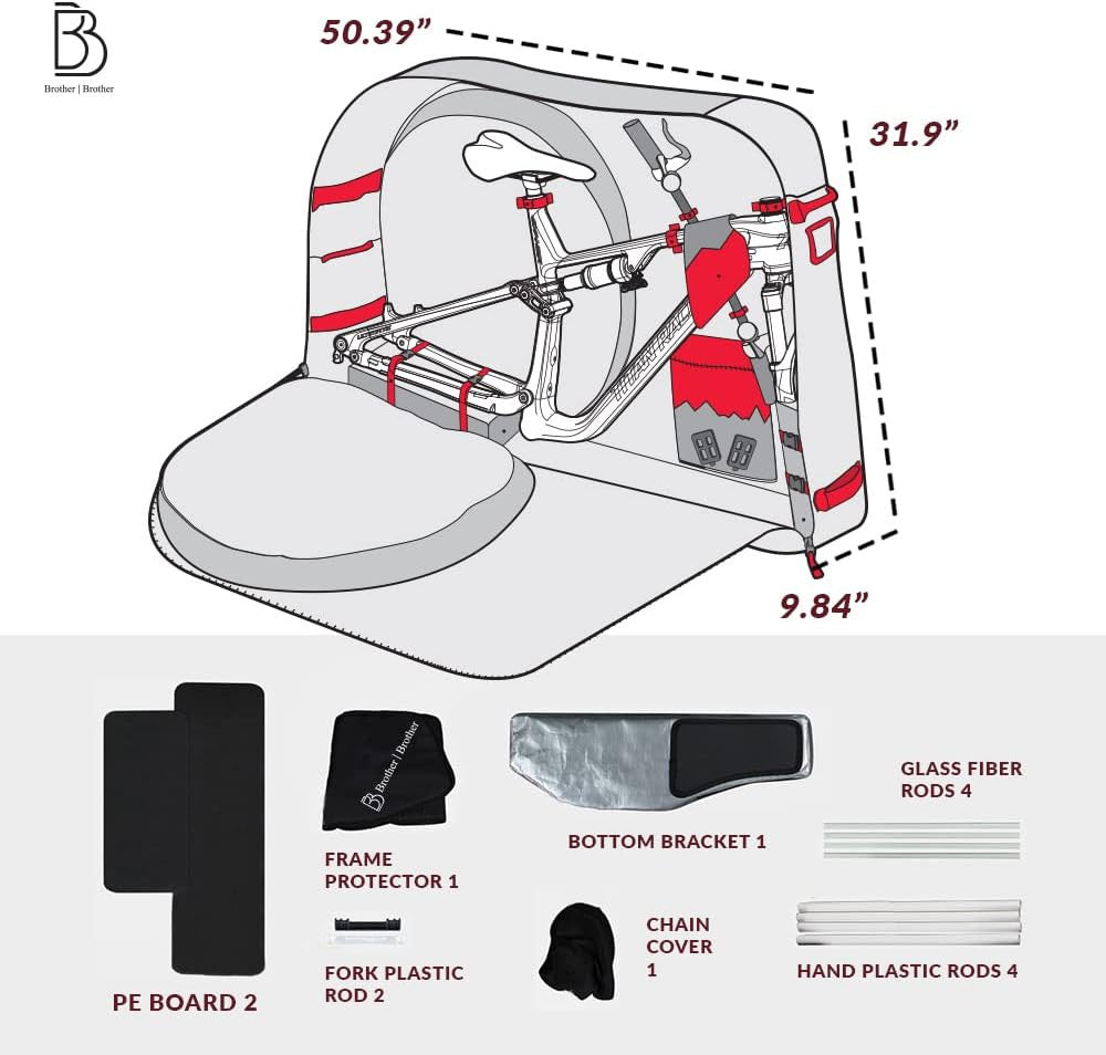 - What's In The Box - Each set comes with 8 products: Bike Travel Bag with Inner Dimensions of 49.6 x 31.1 x 9.45 inches and Outer Dimensions of 50.39 x 31.5 x 9.84 inches. 2 PE boards, frame protector, drivetrainer chain cover, 4 hard plastic rods, 2 fork plastic rods, 4 glass fibre rods, bottom foam block, and a Manual.