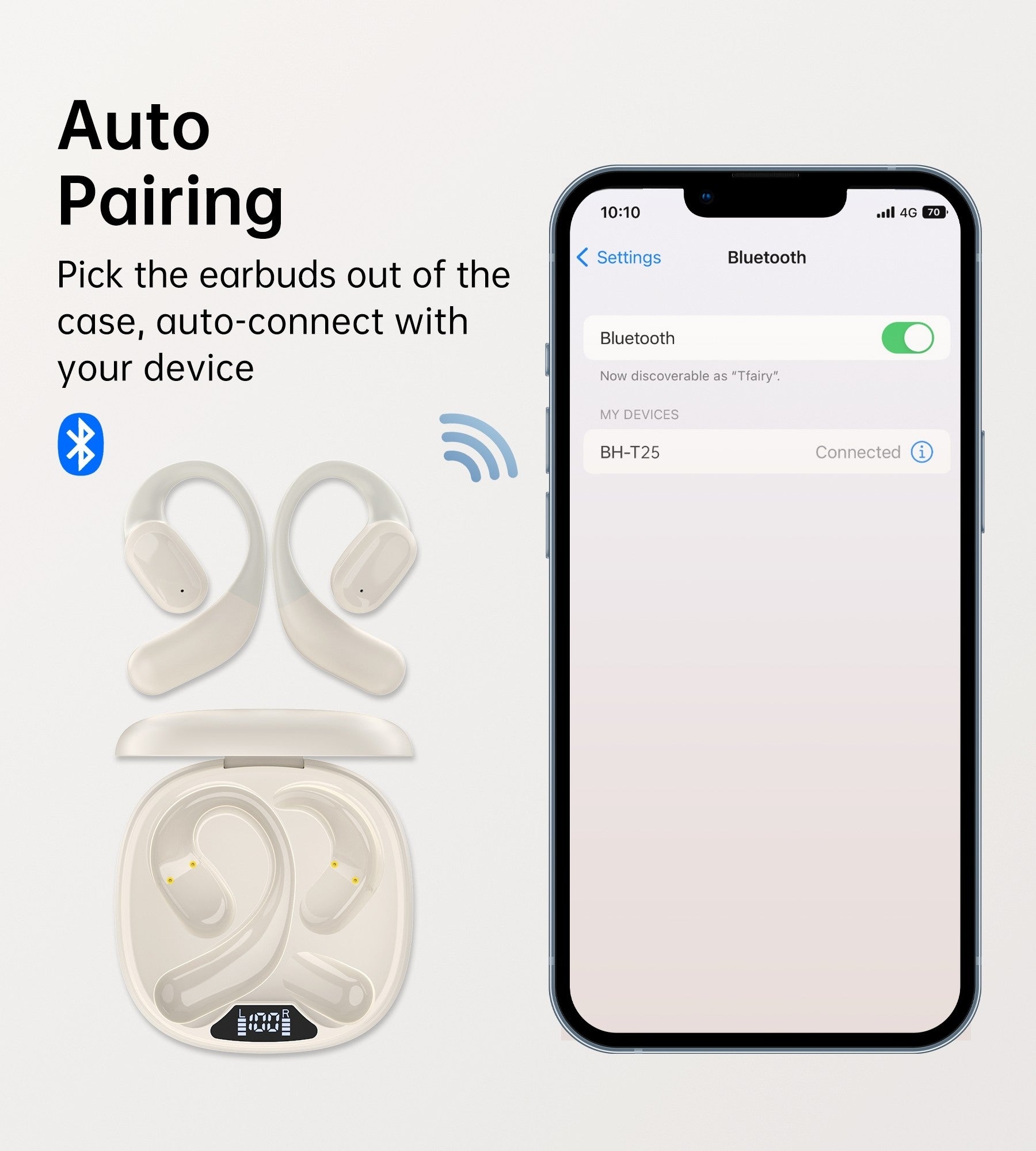 Simply take the earbuds out of the case, then they will automatically connect to your phone.