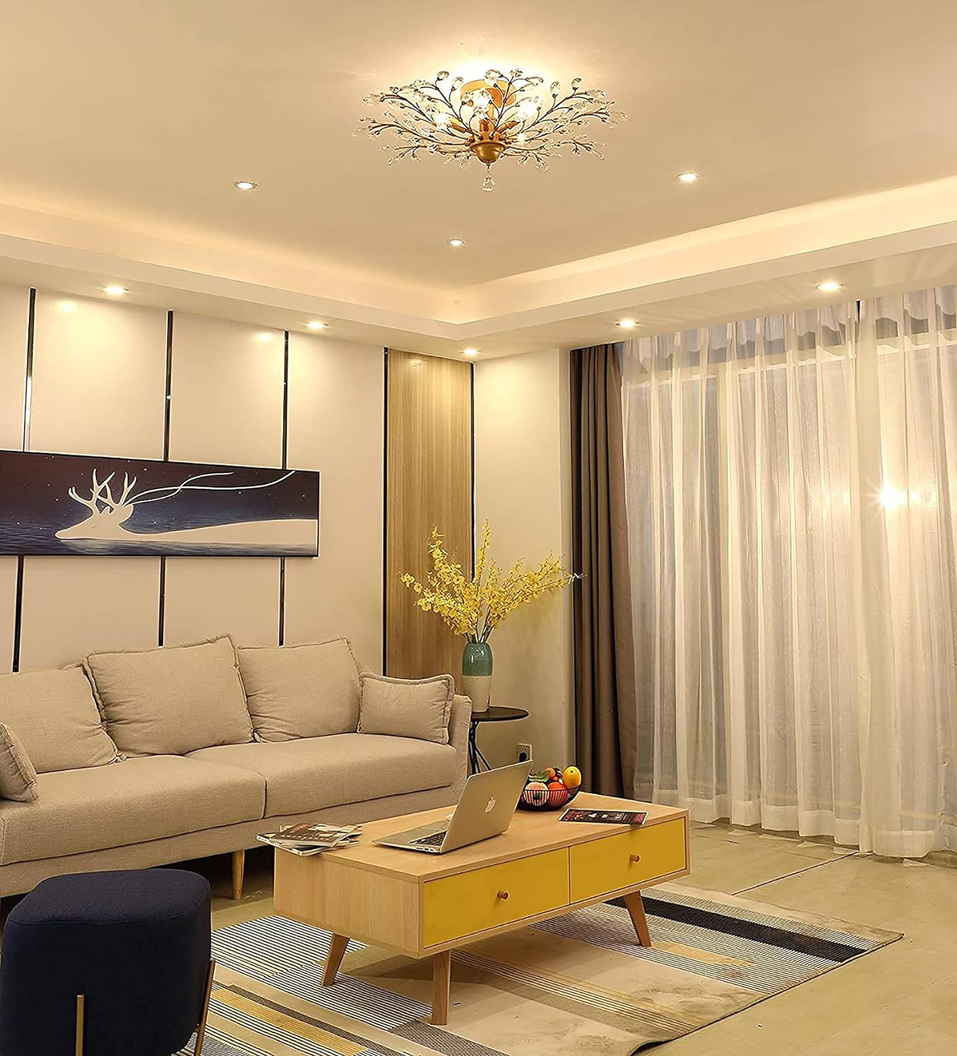 - ELEGANT ATMOSPHERE:This gold ceiling light is adorned with transparent glass crystals that capture and reflect the light of the bulb, creating a warm and inviting atmosphere. Its classic design is sure to add a touch of sophistication to any room.