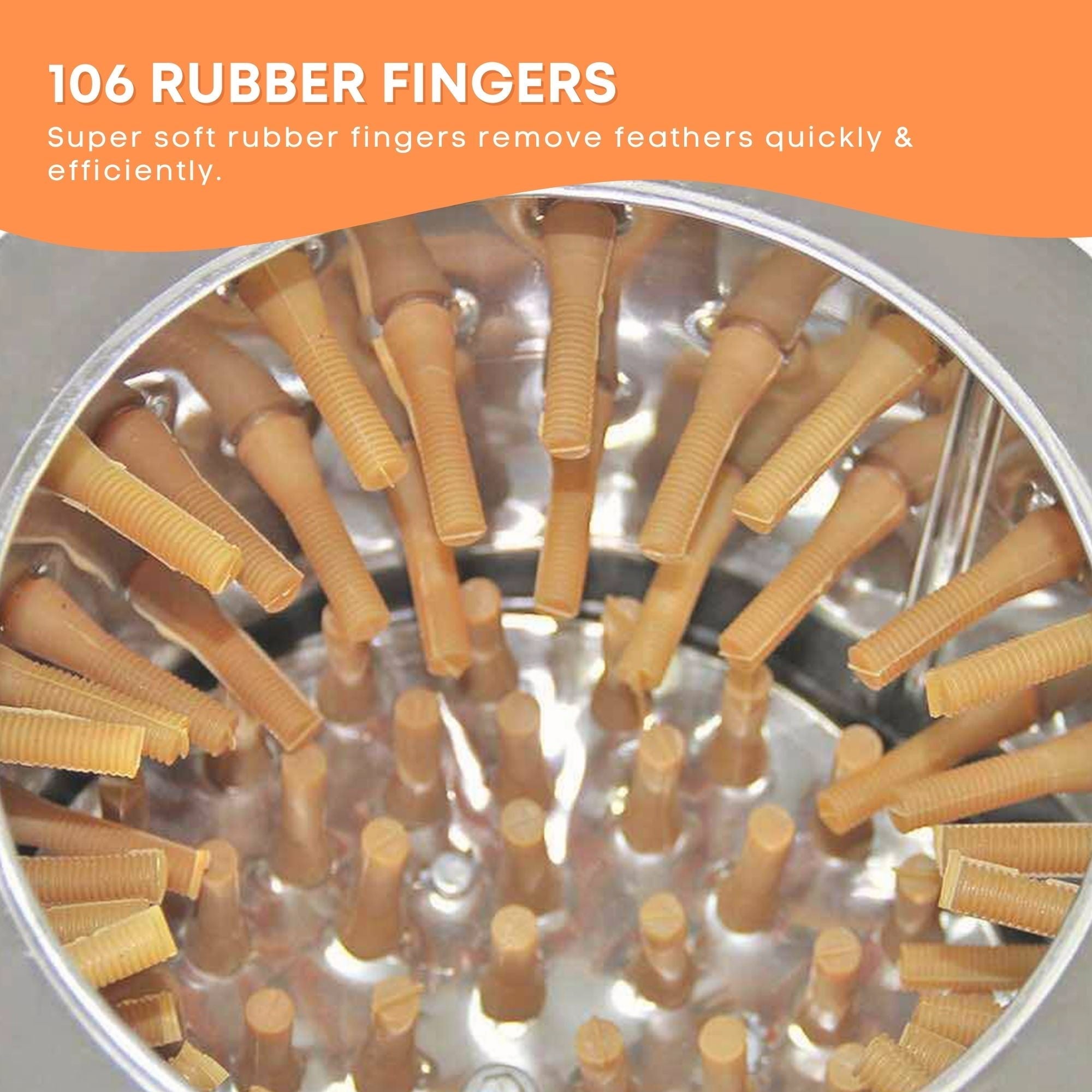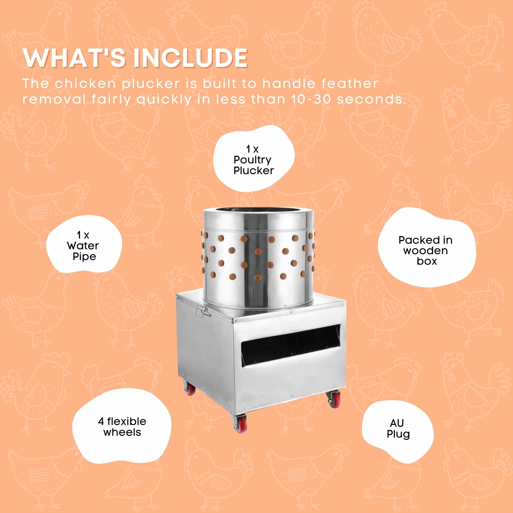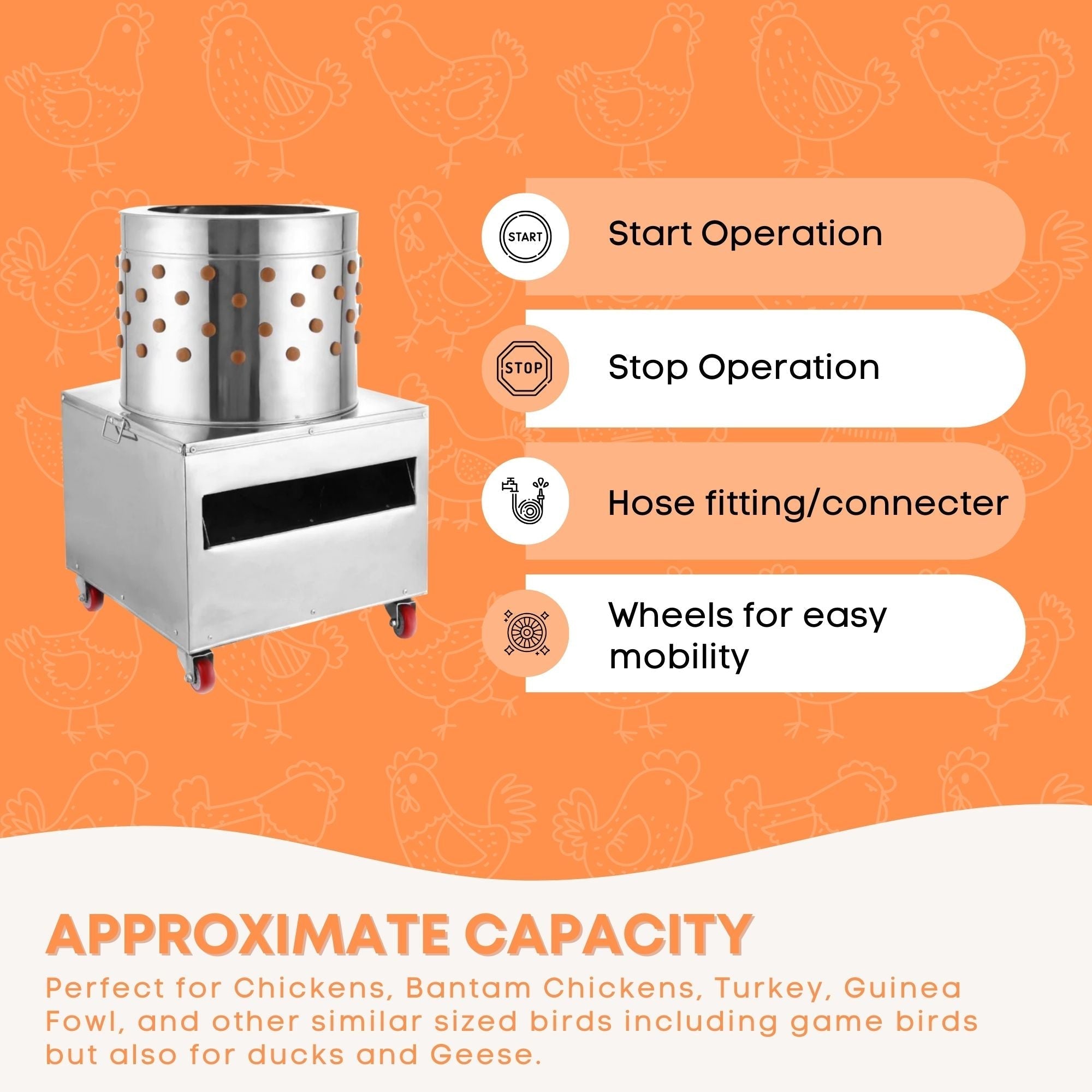 This efficient plucker is designed with four wheels for effortless mobility. With a garden hose attachment and a quick start-up, you can have freshly plucked chickens in under sixty seconds.