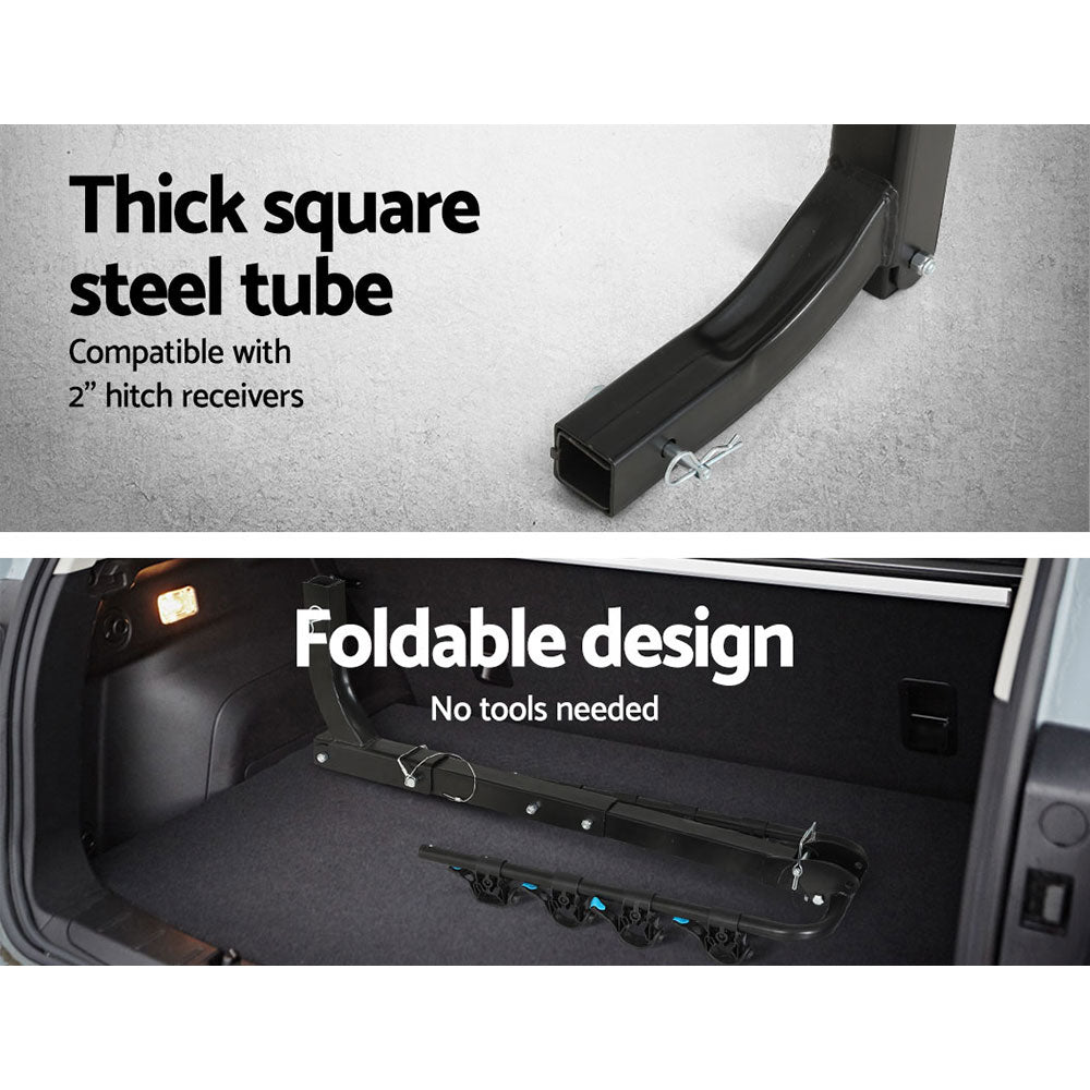 Tired of cycling the same routes all the time? Need to venture further on your bike? Then look no further than the Giantz 4-Bike carrier. Designed to fit most vehicles and various bike types, the 4-Bike carrier makes it easy for bike enthusiasts to ride in new far-off places or different terrains. The carrier is made from durable powder-coated steel and compatible with any 2-inch hitch receiver. Using the carrier is just a simple matter of loading the bike onto the rubber-protected holder and locking it down firmly with the safety lock. No messy around with straps and chains unlike other bike racks. Better still, our carrier conveniently folds down to allow fast and easy access to the rear of the vehicle. And when it comes to keeping the carrier after use, just remove and fold for hassle-free storage. Nothing ventured, nothing gain. And with the Giantz 4-Bike carrier, you can now gain a whole new world of cycling adventures.