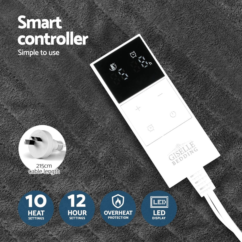 Get that warm and cosy feeling every day with a Giselle Bedding Electric Throw Rug. The double-sided throw rug is made from premium flannel and sherpa fabric, our electric throw rug is just the thing to help you cut down on costly heating bills while still enjoying the heat up-close. The throw rug has all the features of our electric blankets with up to 10 temperature settings, a 12-hour timer, overheat protection, automatic shut-off and a detachable controller with LED display so you can always be in control of the temperature. It is anti-dust mite and bacteria and is machine washable for a clean blanket time and time again. Keep your bedroom or living room cosy and comfortable with a warm and huggable Giselle Bedding Electric Throw Rug.