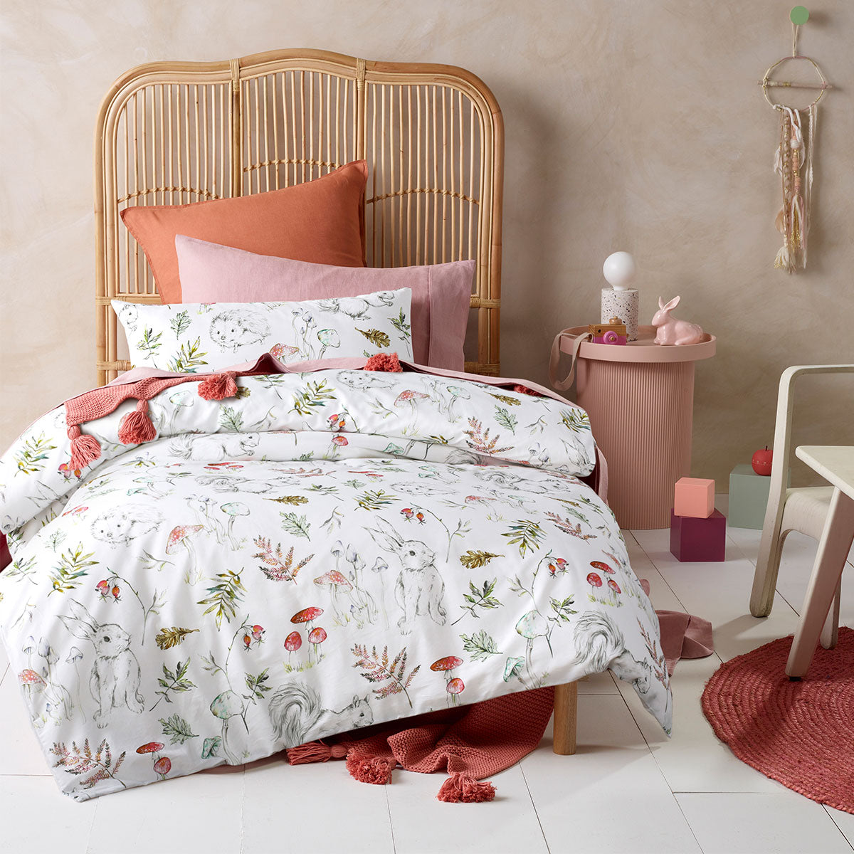 Add some imagination to your kid's bedroom with Story Time White Cotton Digital Printed Quilt Cover Set by Happy Kids. The design features animals such as bunny, squirrel, and hedgehog accented with foliage and mushroom printed in soft tones of black, white, green, pink, grey, and brown that will add a dreamland vibe. It is made from natural breathable cotton that is soft against the skin for a cosy night's sleep.