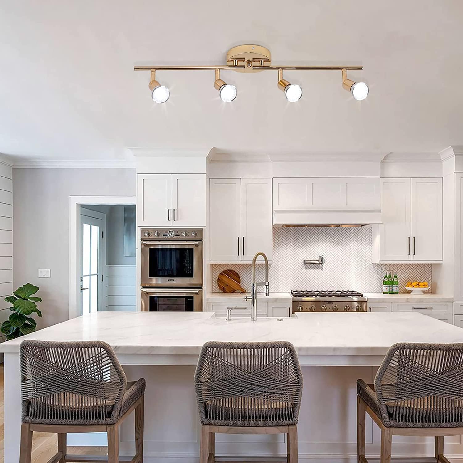 - This gold track lighting is perfect for your kitchen ceiling, providing strong and focused illumination with its 4 x 4W GU10 bulbs. Enjoy a cool white light at 6500K with 400 lumen light output and >85% CRI for a more accurate color rendering of your surroundings. Plus, you can save energy with its 220V voltage.